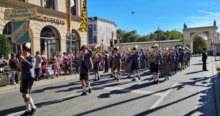 Heuer waren wir im Werbevorläufer mit der Automag vor dem offiziellen Trachten- und Schützenzug unterwegs. Bei strahlendem Wetter und unheimlich vielen Menschen am Straßenrand war das ein bewegendes Erlebnis. Ganz beiläufig waren wir auch die erste Blaskapelle, die spielend ins Augustiner Festzelt eingezogen ist.